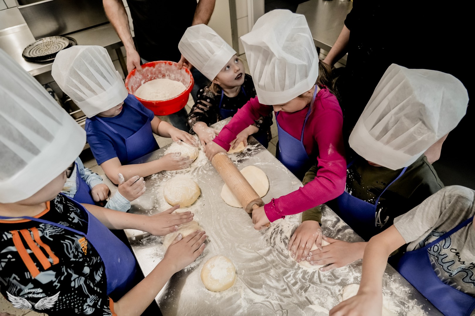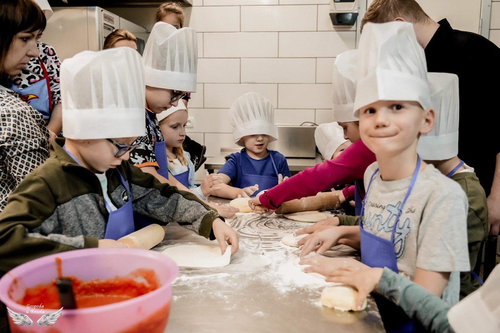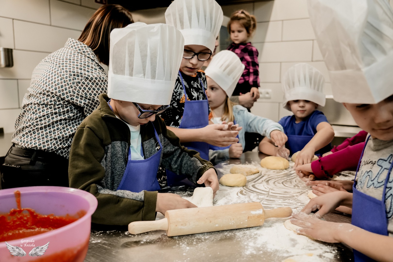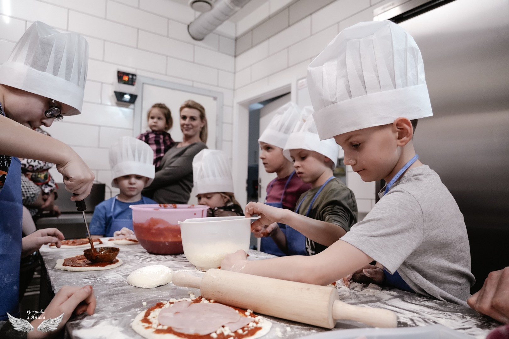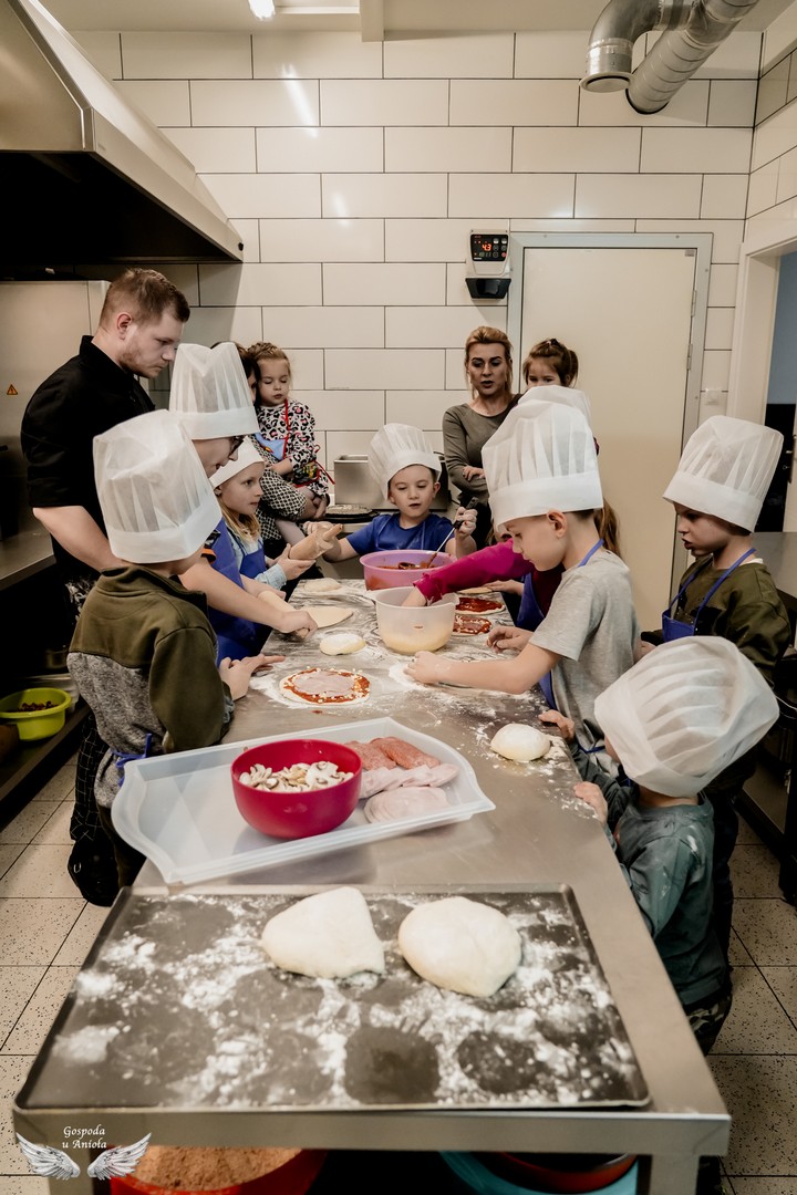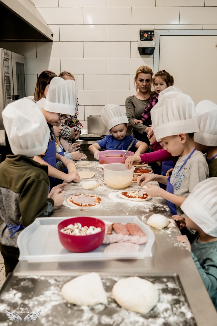 W Gospodzie u Anioła zapanowała radosna wrzawa, gdy dzieci zebrały się, by uczestniczyć w wyjątkowej lekcji robienia pizzy z okazji urodzin. Pod okiem doświadczonego szefa kuchni, maluchy ubrane w miniaprony i czepek z uśmiechami na twarzach, przystąpiły do pracy. Z determinacją i entuzjazmem wybierały ulubione składniki. Wesołe okrzyki towarzyszyły każdemu krojowi i posypywaniu, a na koniec, gdy aromatyczna pizza wyszła z pieca, mali kucharze triumfalnie prezentowały swoje dzieło, gotowe do degustacji na przyjęciu urodzinowym.