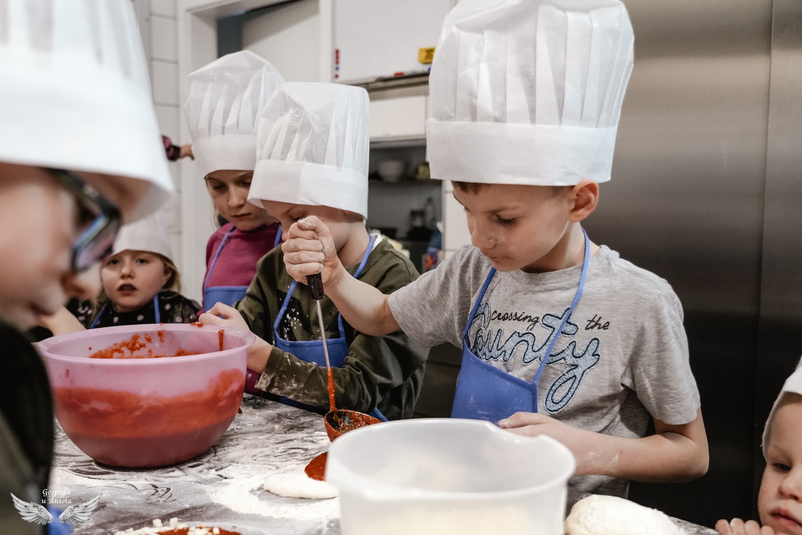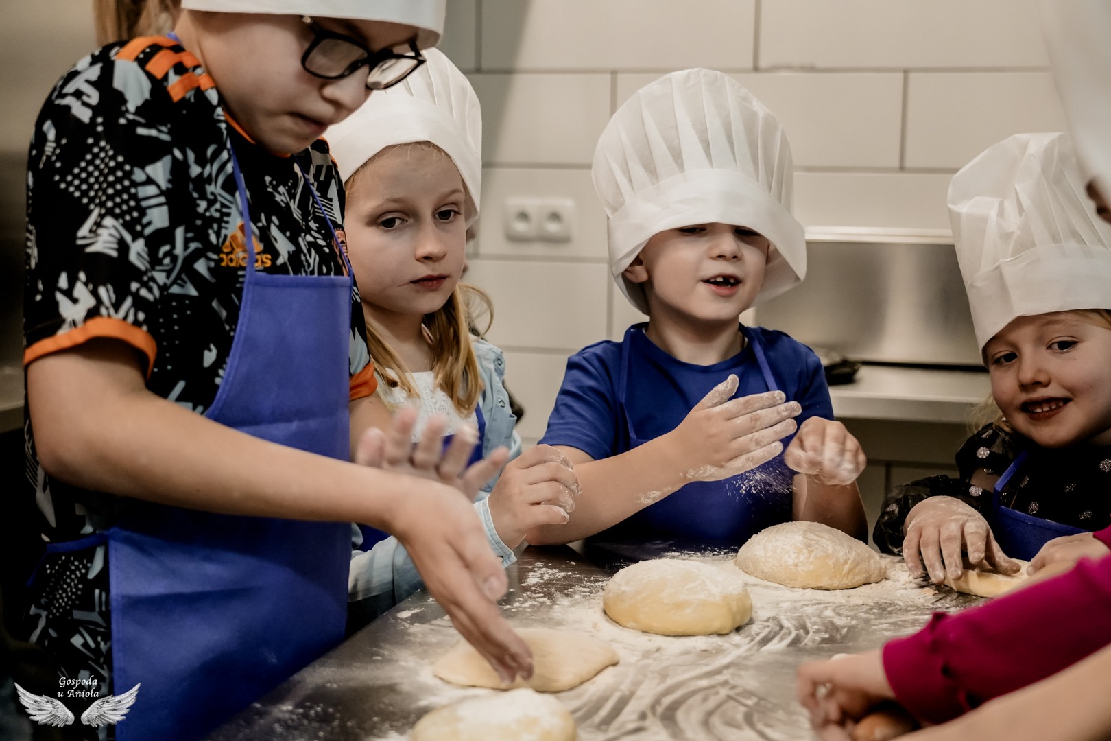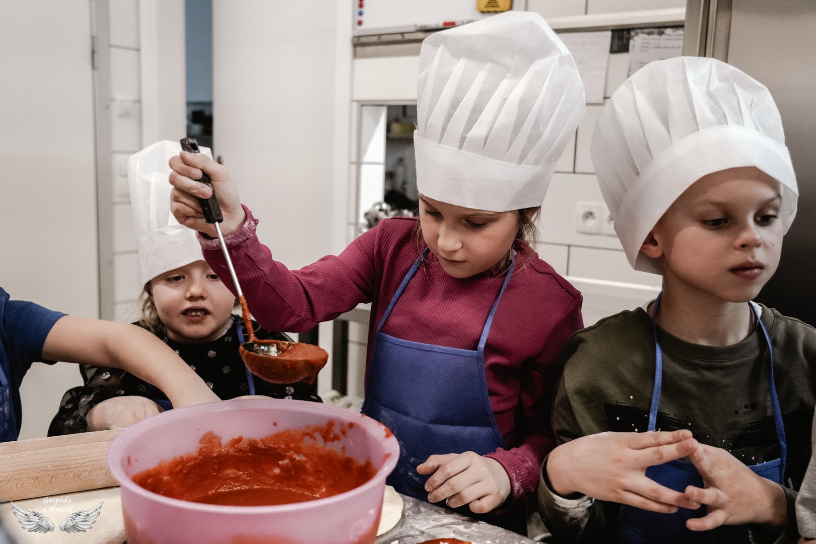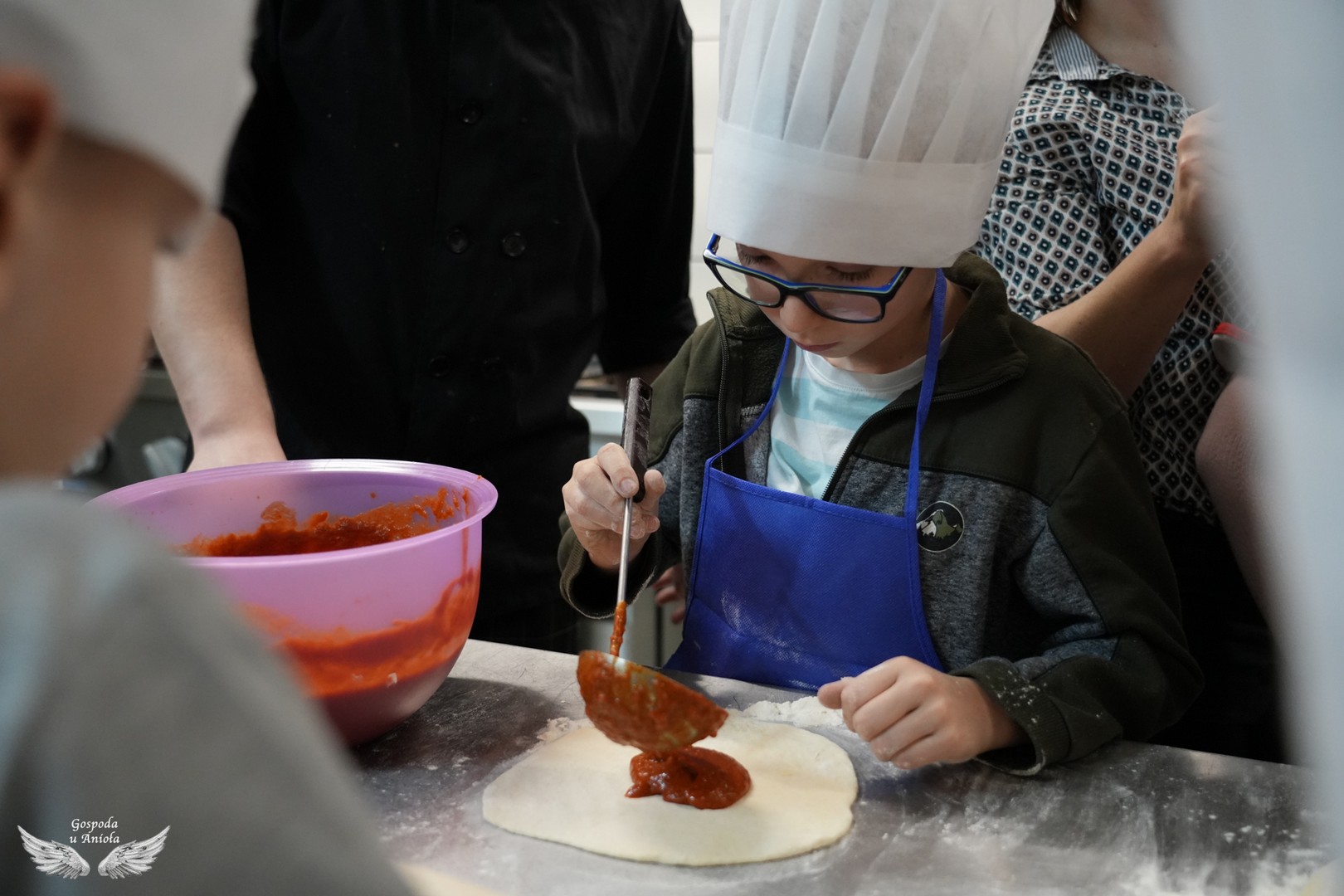 W Gospodzie u Anioła zapanowała radosna wrzawa, gdy dzieci zebrały się, by uczestniczyć w wyjątkowej lekcji robienia pizzy z okazji urodzin. Pod okiem doświadczonego szefa kuchni, maluchy ubrane w miniaprony i czepek z uśmiechami na twarzach, przystąpiły do pracy. Z determinacją i entuzjazmem wybierały ulubione składniki. Wesołe okrzyki towarzyszyły każdemu krojowi i posypywaniu, a na koniec, gdy aromatyczna pizza wyszła z pieca, mali kucharze triumfalnie prezentowały swoje dzieło, gotowe do degustacji na przyjęciu urodzinowym.